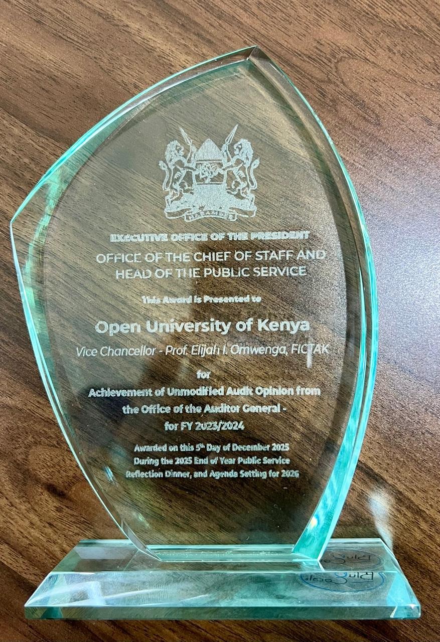 The Open University of Kenya (OUK) has recorded a major institutional milestone after Vice-Chancellor Prof. Elijah Omwenga, FICTAK, was recognised by the Office of the Chief of Staff and Head of Public Service for steering the university to an unmodified audit opinion for the 2023/2024 financial year.